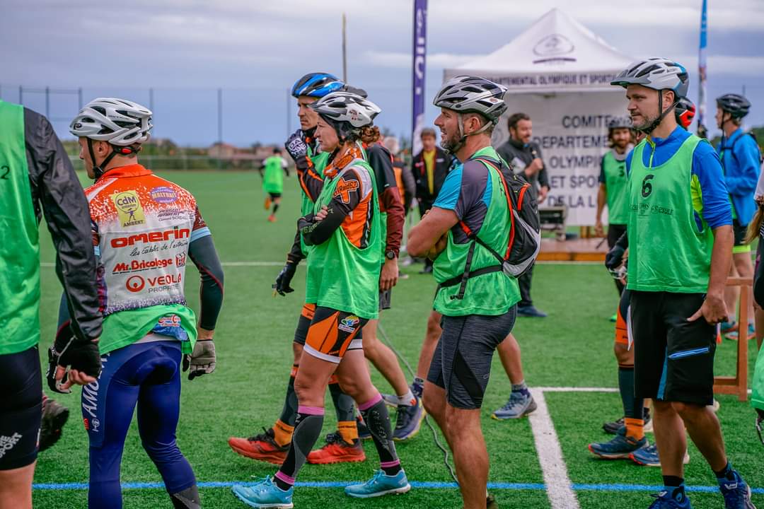 Première section de 6,5km en run&bike (1 vélo pour trois) bien tonique car tout le monde est au coude à coude en début d’épreuve. Puis beaucoup de section VTT (environ 40km) en suivi d’itinéraire sur de l’IGN avec des balises volantes donc peu de choix d’orientation mais il faut appuyer fort sur la pédale et Caro excelle dans ce domaine.