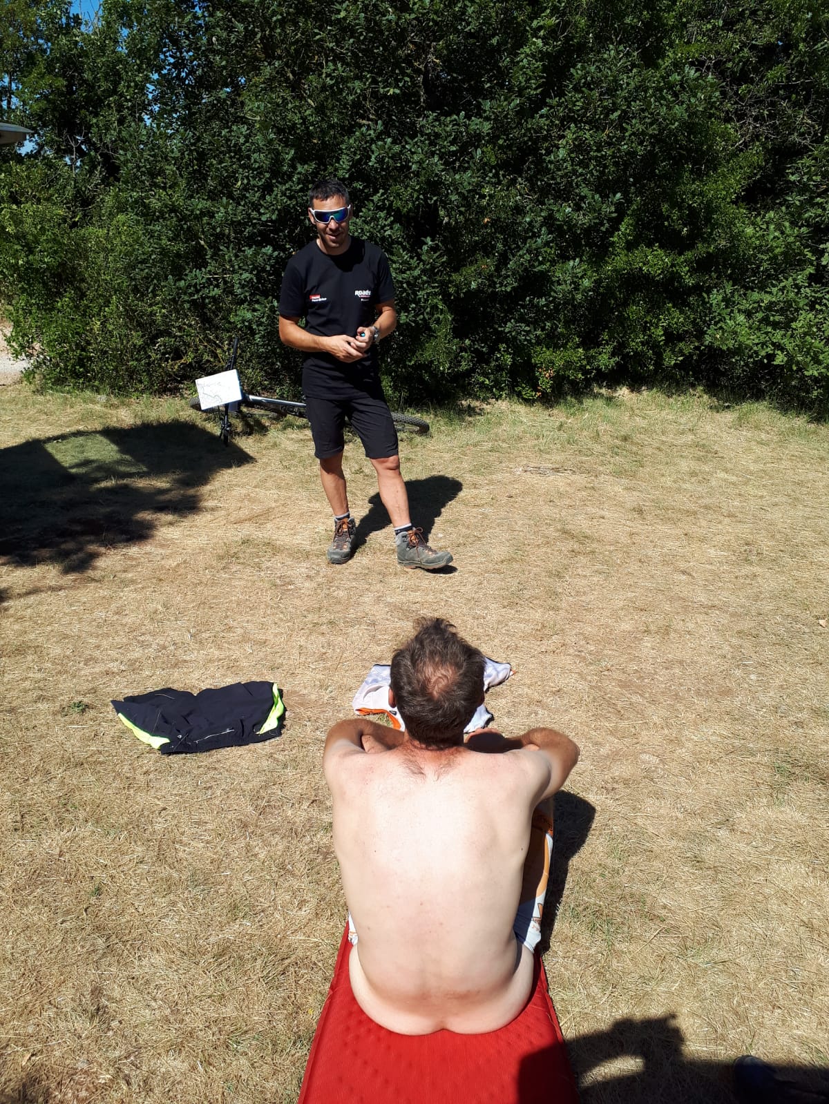 S17. 75 bornes mais plutôt un profil négatif : on contourne le Caroux, on traverse un massif plus au sud et hop plus qu’à traverser la plaine du Languedoc. Sur le papier c’est bien court, mais en vrai la montée fait environ 8km, et quand elle se termine, elle laisse sa place à un portage d’1h15 ! Ce finish cadeau ! Après la montée au pic de la Coquillade, on descend par des pistes forestières puis de la route. Croyez-moi ou non, mais pour une fois j’étais soulagé de ne pas faire du vélo technique ! Dans la plaine qui s’ensuit et qui nous amène à Tourbes pour l’arrivée, voilà Absolu qui nous rejoint. C’est marrant de se dire qu’on a commencé le raid au coude à coude, qu’on s’est bagarré pendant et qu’on va franchir l’arrivée en même temps ! Mais le nombre de balises prises est à notre avantage, heureusement pour nous.