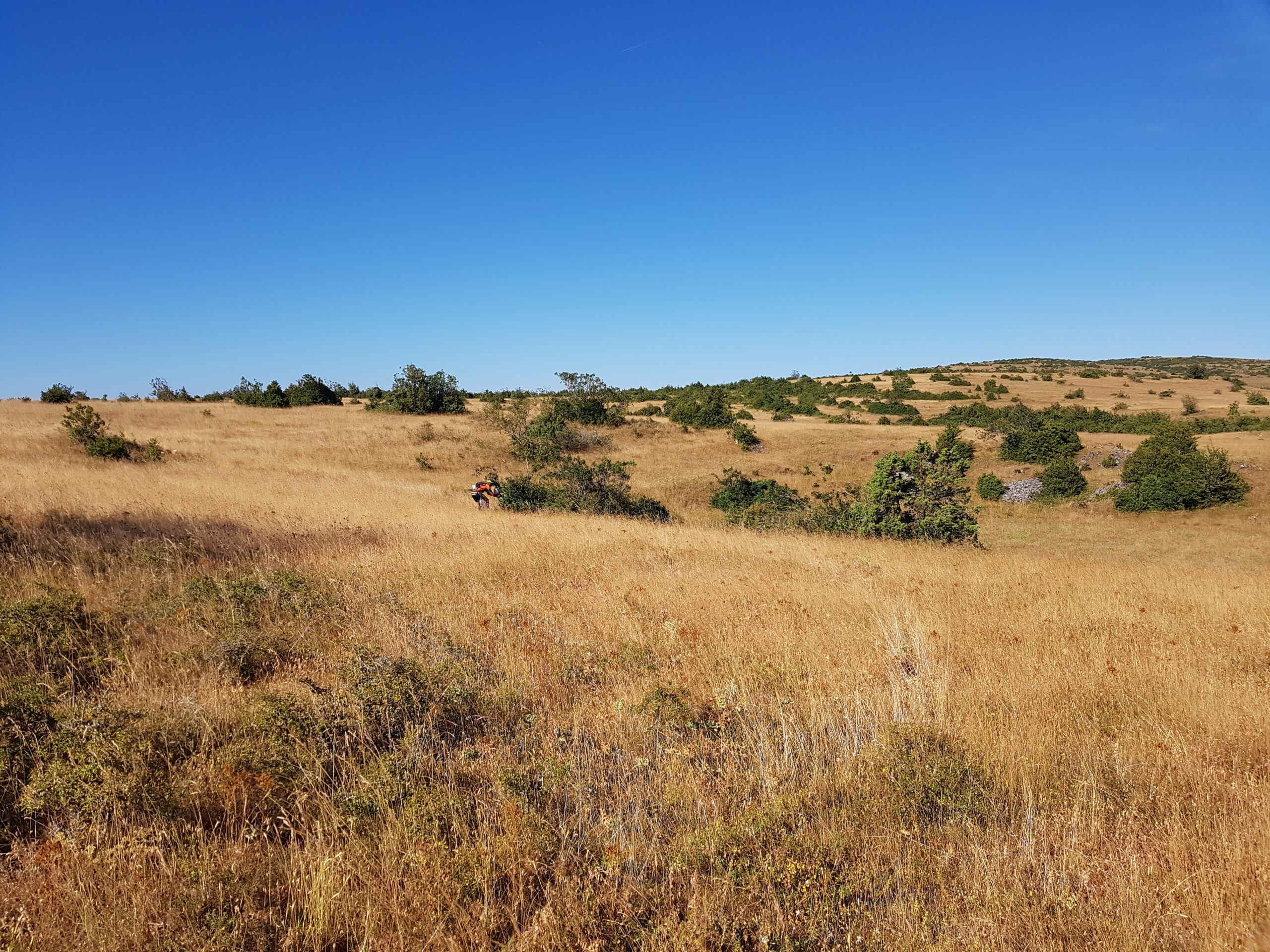 S11. La section de l’engagement physique et surtout stratégique… Celle qui fait mal et qui fait peur. La barrière horaire s’approche et elle est pour dans 2 sections. Si on n’est pas dans les temps c’est 10h de péna, autant dire qu’on saute du viaduc de Millau ! On se donne des portes horaires théoriques de fin de section jusque-là. Et on part tenter de tout prendre sur une section (comme par hasard) très fournie en balises en trail O et CO ultra technique sur le Causse du Guilhaumard. Le terrain est abominable : montée de combe dans le lit du ruisseau puis dans les chadis (? En occitan dans le texte, en français je sais pas comment on dit mais ça pique sévère), puis sur le plateau sous le soleil et dans les rochers. Steve oriente royalement dans le technique. Les 9 balises sont prises, plus qu’à rentrer fissa. On arrive au parking les derniers, tout le monde a shunté soit la section entière soit la majorité des balises. On a entre 7 et 10h d’avance en prenant en compte les pénalités… à condition d’arriver avant la porte horaire dans deux sections…