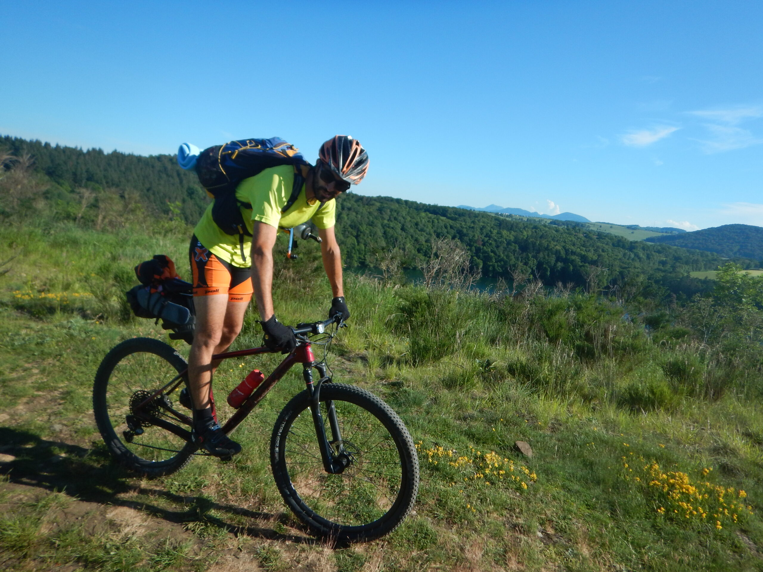 On continue à jouer les grands prix de la montagne, même sur de belles côtés à 20%. Avec nos sacs et sacoches c’est un drôle de spectacle. Miremont, gorges du Sioulet, Pontaumur puis arrivé à Combrailles. On trouve un champ exposé Ouest, fraichement coupé et sec. La Rustine va faire le tour des maisons pour obtenir l’accord des proprios. Dernier bivouac = apéro ! Encore une journée mémorable, surement celles qui laissera le plus d’anecdotes.