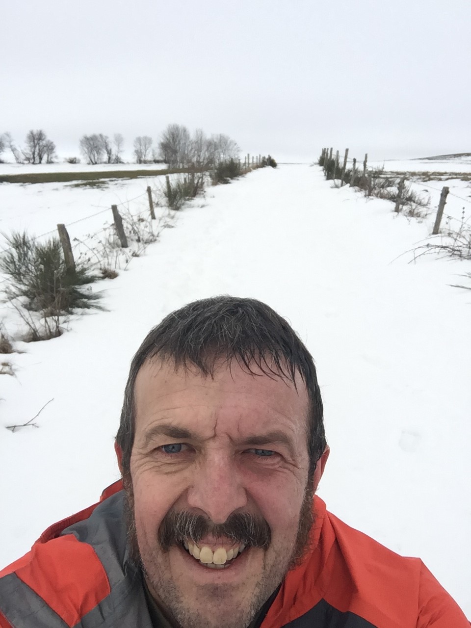 On redescend vers la rivière La Rhue et on se retape une deuxième « patate » où la première féminine me passe devant et un ou deux coureurs du 30km avec des bâtons s’amusent à courir en côte. J’aime bien ce sport qu’est le trail car ça te ramène direct à ta condition et ça te rend humble. On arrive en haut du 2ème plateau et voici le ravito tant attendu que je savais posé vers la moitié de la distance. Un coca, un bout de banane quelques abricots secs, et nous voila reparti dans cette neige si agréable dans les descentes bien qu’un peu piégeuse pour les appuis. Après une bonne traversée du plateau avec quelques coups de vent bien frisquet, on redescend par un GR bien caillouteux et là patatra… à 2 km de l’arrivée, un caillou mal placé me fait tordre la cheville et je tombe dans la boue. Je peste maintenant contre ce sport et repars tant bien que mal en claudiquant. Je termine en alternant la marche et la course.