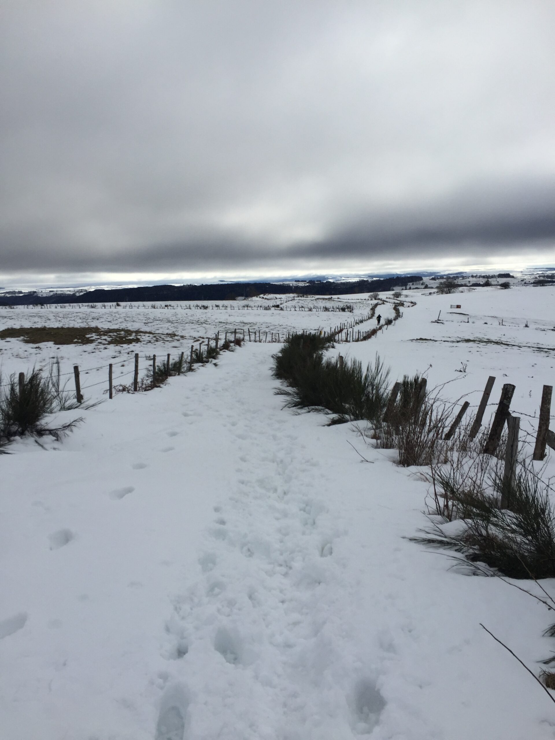 Trois parcours sont proposés : un 31,5 km, un 20km et un 10km. Je choisis le 20 bornes avec 700m de dénivelé positif. Le départ est donné à 13h du complexe sportif de Condat. Nous sommes une soixantaine à nous aligner sur le départ. Hop c’est parti. On part sur quelques singles et bim une première « patate » pour rejoindre le premier plateau enneigé et atteindre les 1000m d’altitude. On passe par des chemins farcis de congères, c’est rigolo ça fait monter les genoux un peu plus que de rigueur.