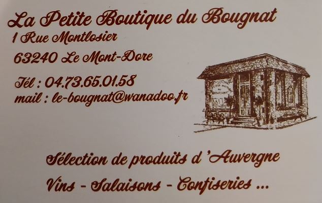 LA PETITE BOUTIQUE DU BOUGNAT1 rue Montlosier sélection de produits d’Auvergne (vins, salaisons, confiserie) 04 73 65 01 58 |